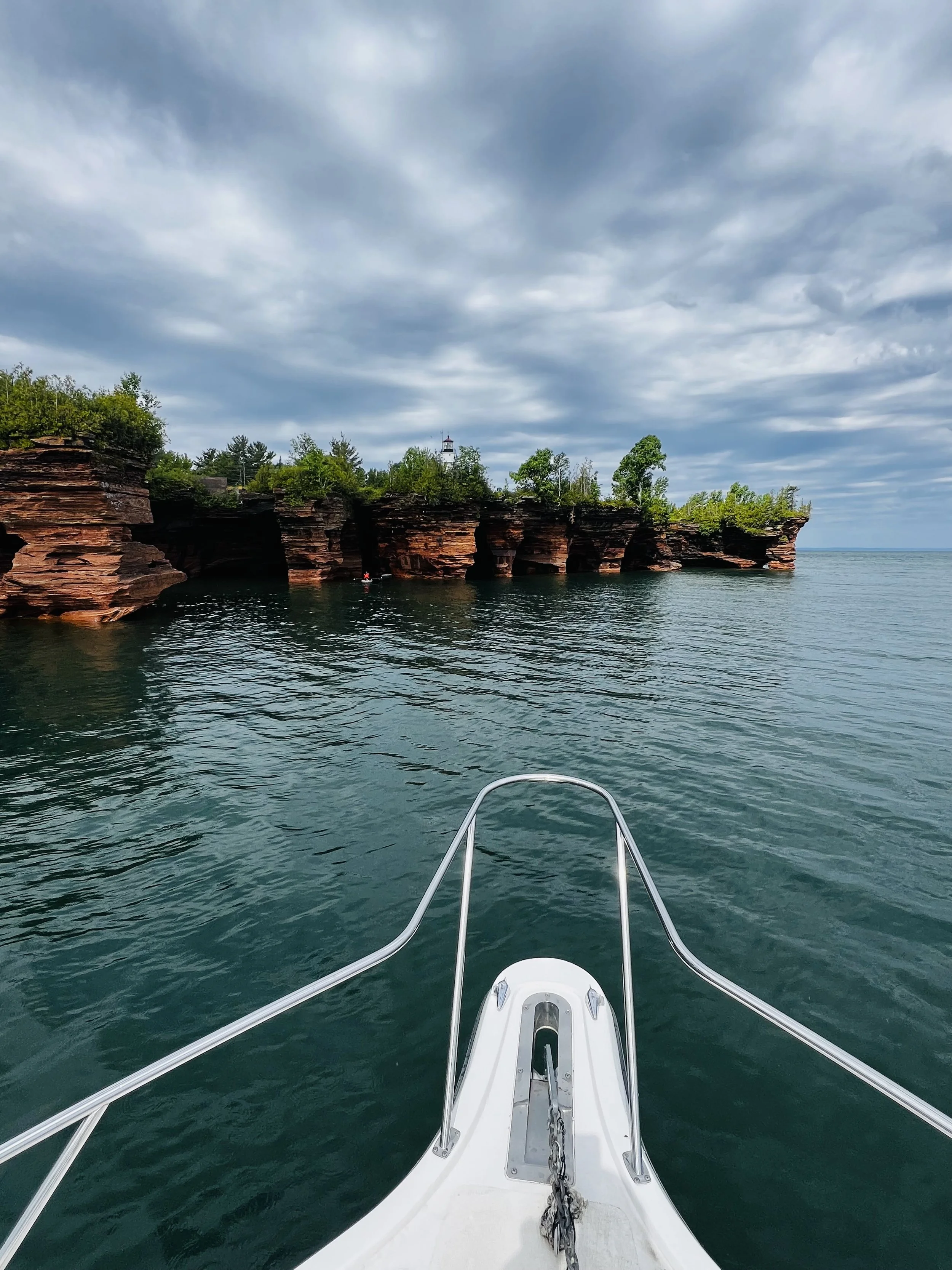 The Apostle Islands aren’t something you fully experience from land. The real magic is out there—beyond Bayfield, beyond the marinas—where sandstone cliffs rise straight from the water, sea caves echo with waves, and islands feel untouched.